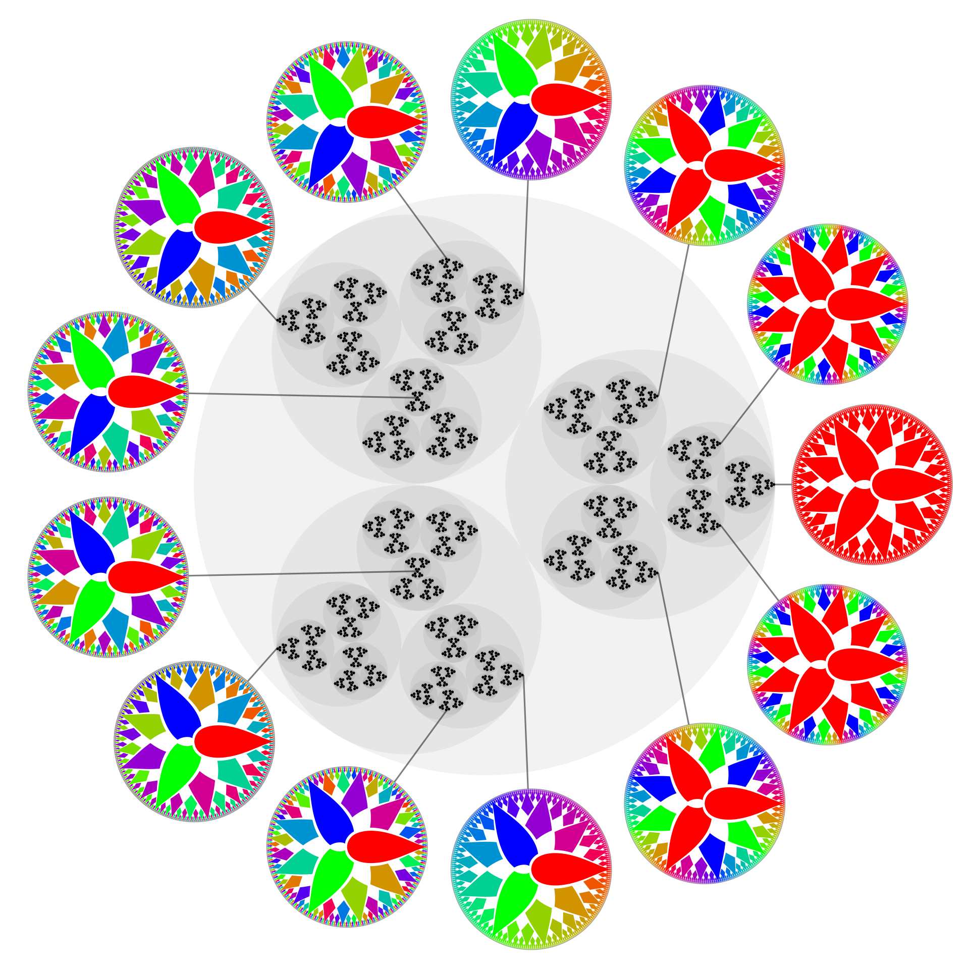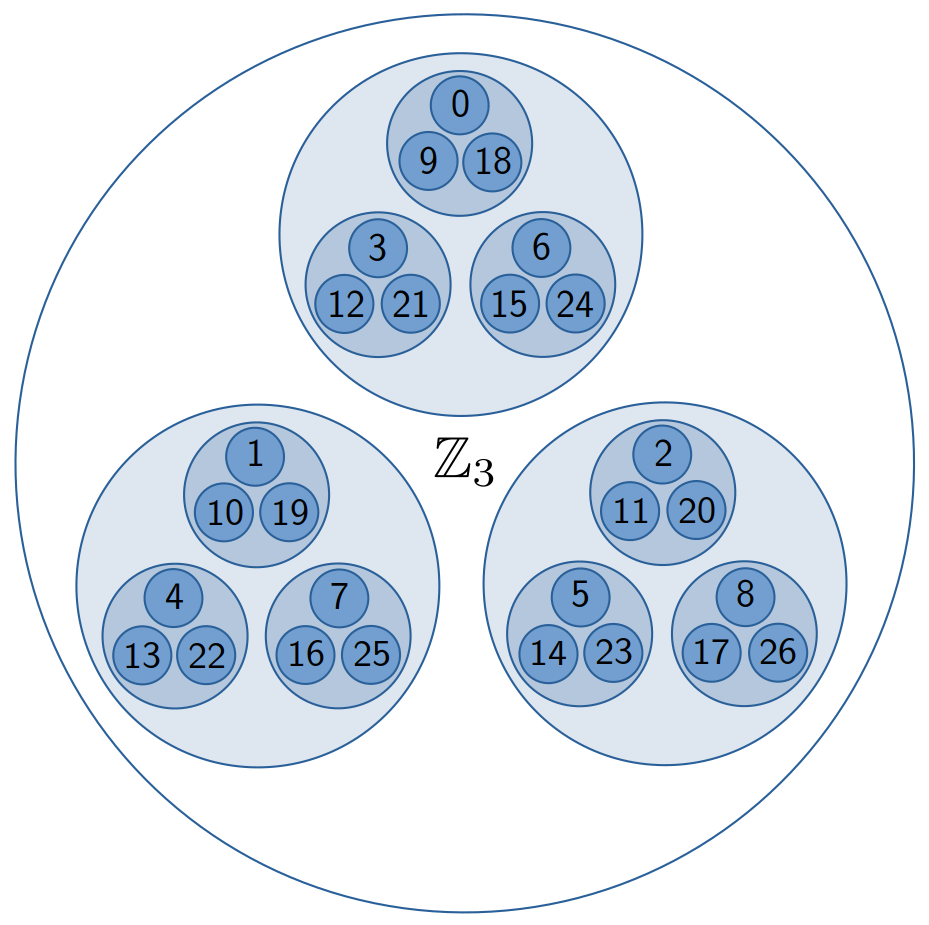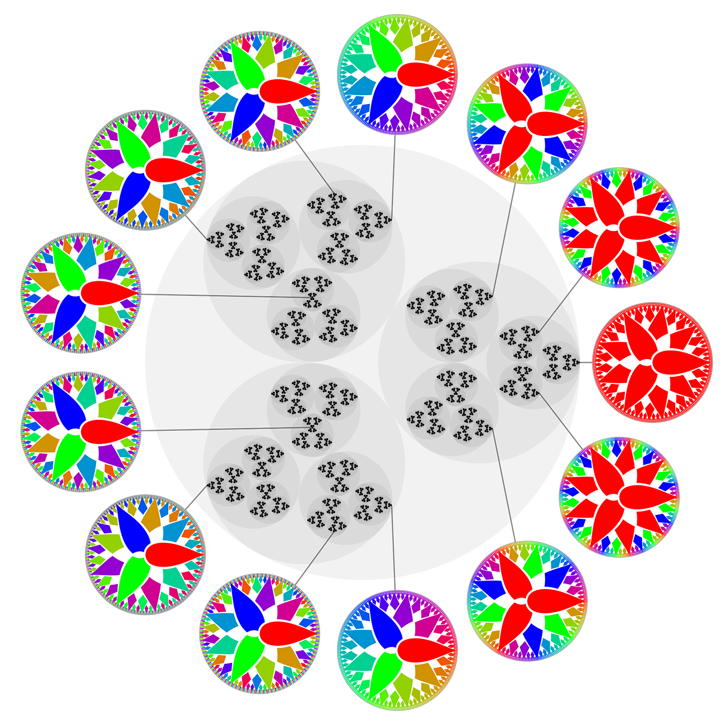 So far so good? Once you have a notion of “size,” you can move on to the idea of “distance.” Just define the “distance” between two numbers as the “size” of their difference.2 That totally works with the size you know and love, but when you pull out one of these other sizes, things get pretty weird. In our wacky new world, numbers are closer together if they are separated by higher powers of p, so 1 and 10 are closer than 1 and 4. If we now act like demented topologists and try to visualize this as an actual space, it’s a disturbing and confusing one where, for instance, all triangles are isoceles. My own way of visualizing this is that we’ve ripped the numbers out of their usual locations and placed them in a vast tree, like the tree of life or a family tree, organized by powers of p, and the “distances” in this tree are measured how many levels of branches you need to traverse to get from one number to another.