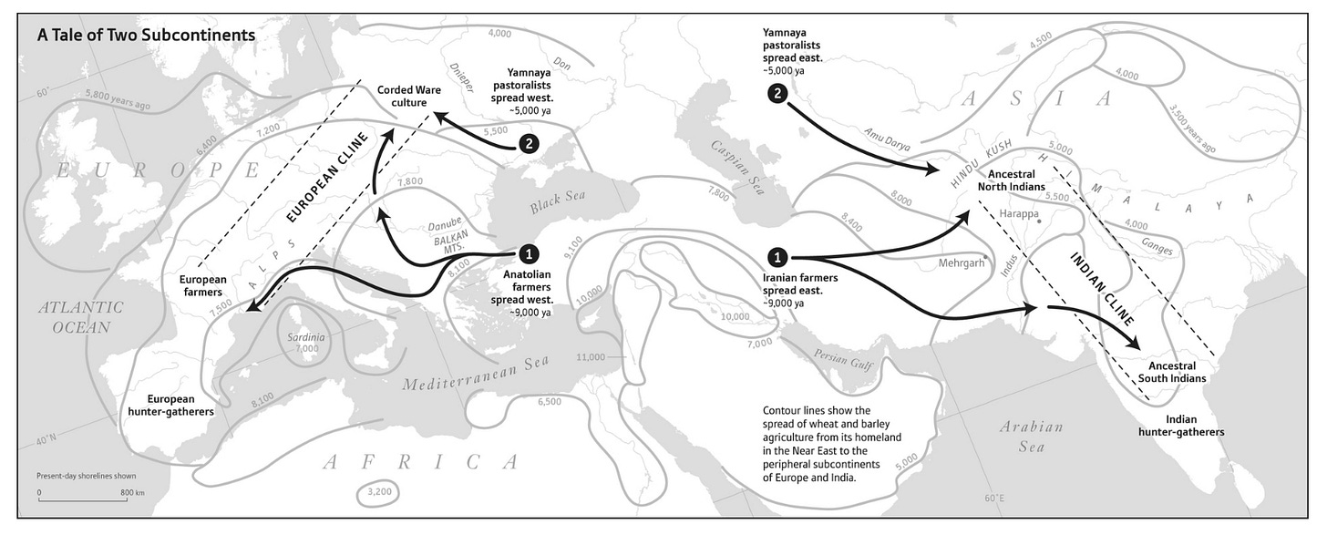 Sometime between when my grandfather gave me a copy of Luca Cavalli-Sforza's Genes, Peoples, and Languages for my birthday and when you and I decided to read Reich's book together, two big things happened: humans got really, really good at sequencing and reading genomes, and Svante Pääbo’s lab in Leipzig got really, really good at extracting DNA from ancient bones. (How they developed their procedures is actually a really interesting story, which Pääbo retells in his book, but Reich — whose lab uses the same techniques on an industrial scale — gives a good, brief summary of how it works.) Together, these two advances unlocked…well, not quite everything about the deep past, but an absolutely enormous amount. Suddenly we can track the people, not just the pots, and the story is more complicated and fascinating than anything we might have expected. I’ve written elsewhere about some of the aDNA discoveries about human evolution (Neanderthal admixture, the Denisovans, etc.), but I’m even more excited about what ancient DNA reveals about our more recent past. Luckily, that’s what Reich spends most of the book on, with discussion of ancient ghost populations who now exist only in admixture and then chapters on the specific population genetic histories of Europe, India, North America, East Asia, and Africa, each of which contains some discoveries that would make (at least the more sensible) archaeologists and historical linguists go “well, duh” and others that are real surprises.