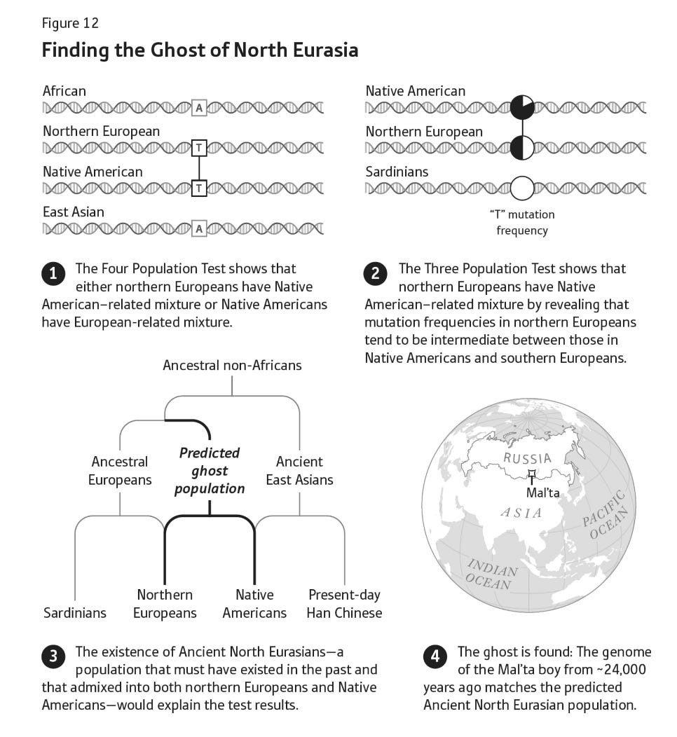 One of the “duh” stories is the final, conclusive identification of the people who brought horses, wagons, and Indo-European languages to Europe with the Yamnaya culture of the Pontic Steppe and their descendants. (David Anthony gives a very good overview of the archaeological case for this is The Wheel, the Horse, and Language, including some very cool experimental archaeology about horse teeth; you have my permission to skim the sections on pots.) My favorite surprising result, though, comes from a little farther north. People usually assume that Native Americans and East Asians share a common ancestor who split from the ancestors of Europeans and Africans before dividing into those two populations, but when Reich’s lab was trying to test the idea they found, to their surprise, that in places where Northern European genomes differ from Africans’, they are closer to Native Americans than to East Asians. Then, using a different set of statistical techniques, they found that Northern European populations were the product of mixture between two groups, one very similar to Sardinians (who are themselves almost-unmixed descendants of the first European farmers) and one that is most similar to Native Americans. They theorized a “ghost” population, which they called the “Ancient North Eurasians,” who had contributed DNA both to the population that would eventually cross the Bering land bridge and to the non-Early European Farmer ancestors of modern Northern Europeans. Several years later, another team sequenced the genome of a boy who died in Siberia 24kya and who was a perfect match for that theorized ghost ANE population.