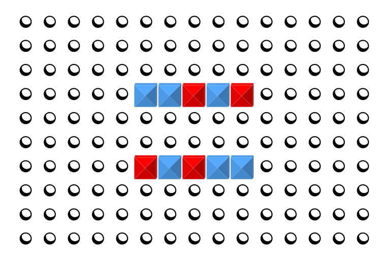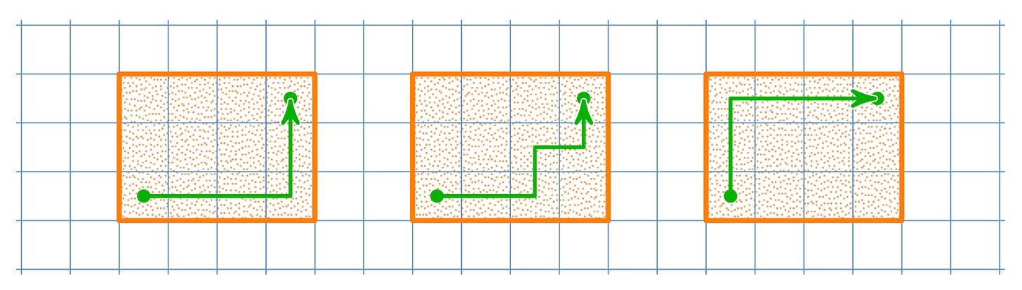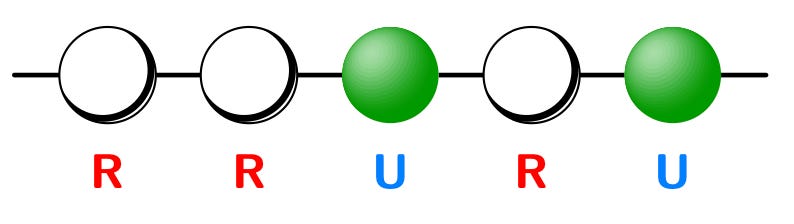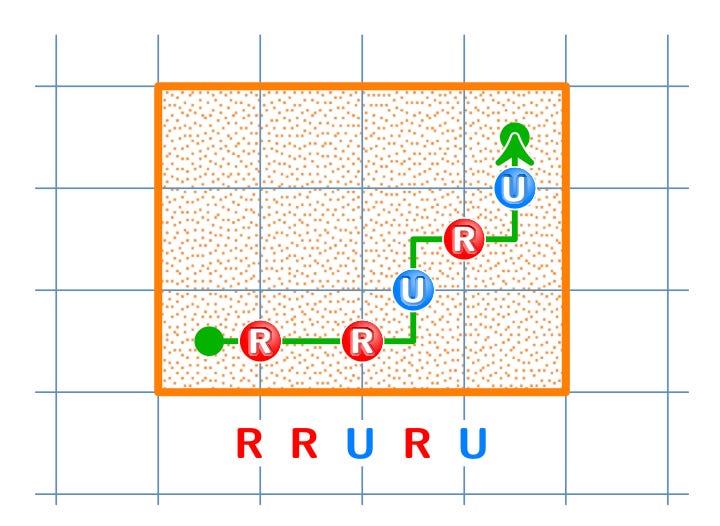 More months go by, and it’s time for the problem to visit again. This time he brings a 4x3 grid, and explains that it’s a city map, and that a taxi is starting in the lower-left corner, and wants to go to the top-right corner, and asks how many possible paths it can take with no backtracking. Once again they leap into action. Once again he asks if this reminds them of anything. The kids are confused, they’ve never played the taxi game before. This time he drops a hint, takes one of their paths, and each time the taxi makes a decision to go right, he draws a little red circle, and each time it goes up he draws a little blue circle. Pandemonium. The kids are going nuts. They have discovered the beauty of isomorphism, a secret passage leading from one part of the world, up into the Platonic realm, and back into another superficially very different place. But they still haven’t answered the problem.