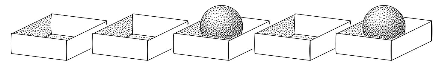 He lets a couple more months go by. Now he places five empty matchboxes and two balls on the table. How many different ways are there to put the balls in the boxes? This time the kids figure it out quickly: it’s the same as the puzzle with the beads! And that means they’re finally ready to stare the problem in the face, ready to begin their ascent of this mountain. The answers to all of these puzzles, which are really all the same puzzle in different clothing, is that there are ten ways. But if we enumerate all ten of them, how can we prove that there aren’t any more? And what if our original set had four items or six items instead of five, how would the answer change? And these little kids who don’t yet know their times tables will totally figure it out.