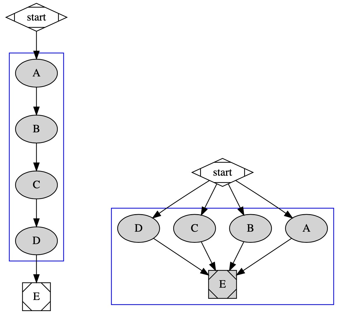 So we believe because we believe, so far so Bayesian. What’s new about this? But Belloc now makes an argument that the large-scale graph structure of our beliefs is in some cases more important than the mere conditional probabilities we assign to the edges. Consider two situations: in the first, A implies B, which in turn implies C, which then implies D, which finally implies E. Moreover, we are quite certain about each of these implications. In the second situation, A, B, C, and D are all pieces of evidence pointing towards E, but our confidence in each of them is much lower.