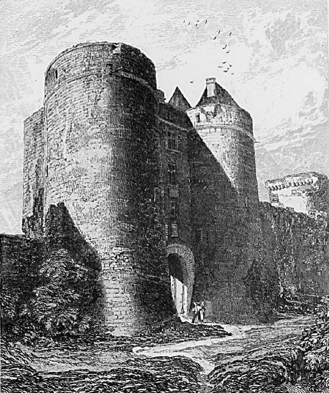 […the] ruthless castellan [of the castle of Châteauroux] took one of his enemies captive and, so as to ensure that he posed no further threat, had the poor wretch blinded and castrated. … Thus emasculated, the man remained a prisoner for many years, but was given the freedom to roam the fortress, crawling and stumbling as he went. In time, however, he ‘committed to memory all [its] passageways and even the steps which led up to the towers’, and through all these long days, forgotten and ignored by those around him, the man nursed his cold hatred. …when an opportunity presented itself, the mutilated captive took sudden and terrible action. Seizing the lord of Châteauroux’s only son and heir, the prisoner dragged the boy ‘to the topmost crenellation of one of the towers’, locking all the doors behind him, and there ‘he stood outlined against the sky, threatening to throw the boy over’. The castle erupted in chaos as ‘everyone screamed in anguish’. According to Gerald: