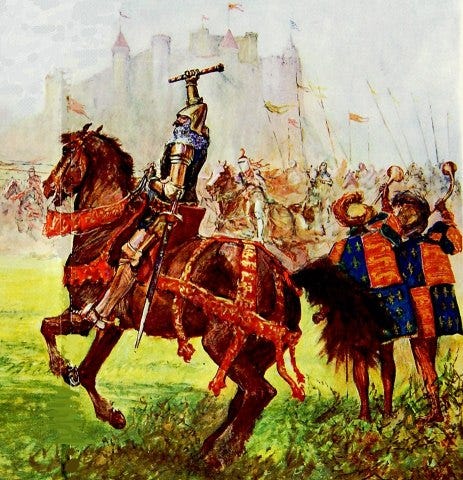 Unlike a real battle, where honor and self-interest could come into dramatic conflict (with a castle or kingdom on the line, who wouldn’t be tempted to surrender and then, uh, strategically un-surrender when the enemy’s back was turned?), a tournament was thrilling and dangerous but still a game11 — and games are only fun if there are rules. The code of what it meant to be a guy on a horse, a chevalier, grew from the rules of a game whose audience was identical to its participants. As chevalerie went beyond what necessarily adheres to guys on horses, it came to govern the honorable behavior of knights to other knights: protecting your lord, keeping your word and staying captured once you’d been captured, engaging only armored opponents rather than sneaking into the tent where men went to rest and get a drink of water (yes, “base” in what was essentially the world’s most dangerous game of tag). A warrior class that constructed its social identity partly through these tournaments would keep those ideals on a real battlefield, too. Plenty of other societies had heavy cavalry (the Mongols did, and every empire from the Persians to the Byzantines had cataphracts): what made a knight a knight wasn’t the existence of the armored man on a horse but the specific culture that formed around him.