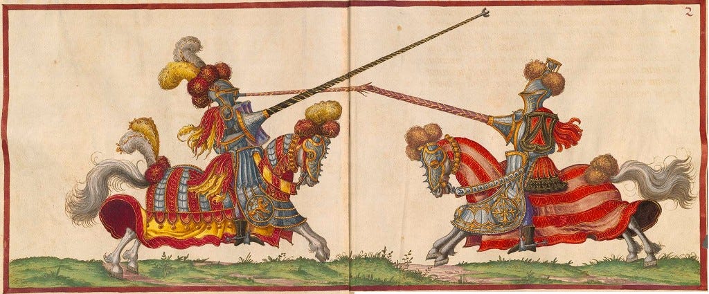 “But wait!” you may well cry: obviously they do put tournament scenes in the movies, from the technicolor to the grimdark to the plain old goofy. But all that gallant jousting and ladies’ favors comes later: the tournaments of his day, Asbridge writes, “were entirely different beasts: imbued with some pageantry and awash with colour, yes, but riotous, chaotic affairs, tantamount to large-scale war games, played out by teams of mounted knights across great swathes of territory.” Hundreds or even thousands of knights gathered in whatever town was hosting the games, organized into two coalitions of allied teams distinguished by color (typically English/Norman vs. French), then battled across many square miles of countryside over the course of the day. For a modern equivalent in terms of social class, danger, and expense, you might imagine a horde of Saudi princelings descending on a succession of cities to race Formula One cars through the streets. Tournaments weren’t intended to kill — the goal was to capture an opponent and ransom him back for the price of his armor and horse, which could be astronomical — but of course men did die. (In fact, one could argue that tournament lethality is responsible for the entire Anglo-American constitutional tradition: Geoffrey, Duke of Brittany, the brother between Richard the Lionheart and King John in the birth order, was accidentally trampled to death by his mesnie during a tournament in Paris a few years before their father’s death. And while counterfactuals are hard, my guess is that Geoffrey was politically competent enough that he wouldn’t have gotten stuck signing the Magna Carta. John was really very bad at being king.)
